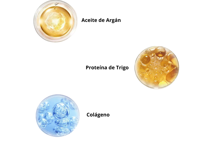 Formulada con aceite de argán, el oro líquido de Marruecos, para una nutrición profunda y protección antioxidante. Enriquecida con colágeno puro de alta penetración que repara y fortalece desde el interior. Además, contiene proteína de trigo + vitamina A (Keratina) para máxima regeneración y elasticidad.